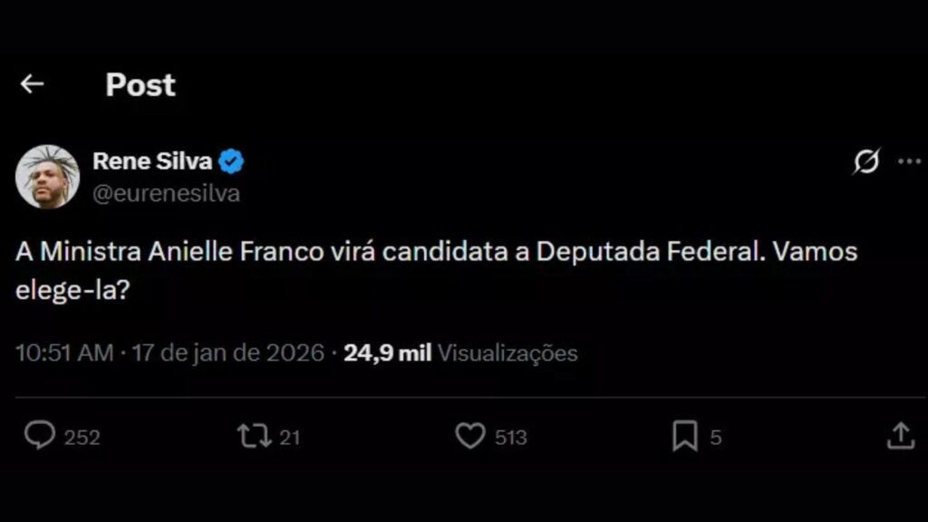 Anielle Franco confirmou no início de janeiro que deixará o comando do Ministério da Igualdade Racial para disputar uma vaga no Legislativo Federal nas eleições de outubro. Ao tentar impulsionar o nome da ministra para seus mais de 300 mil seguidores, Rene Silva lançou a pergunta: “A ministra Anielle Franco virá candidata a deputada federal. Vamos elegê-la?”.