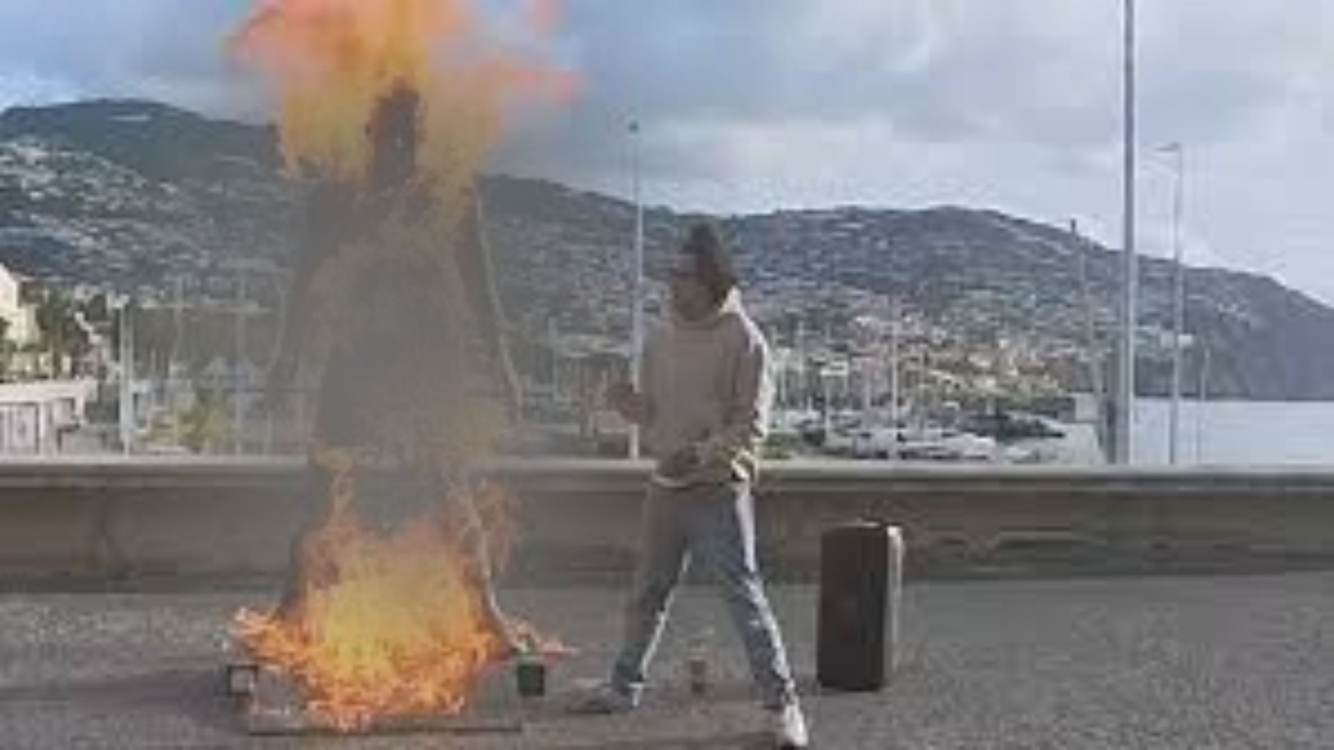 Nas imagens publicadas no Instagram, o indivíduo aparece despejando líquido inflamável sobre o monumento, que reproduz o jogador em tamanho real, e iniciando o incêndio logo em seguida. Na postagem, o homem marcou o perfil oficial de Cristiano Ronaldo e incluiu uma mensagem de tom enigmático, afirmando ser um "último aviso de Deus".