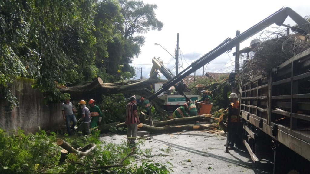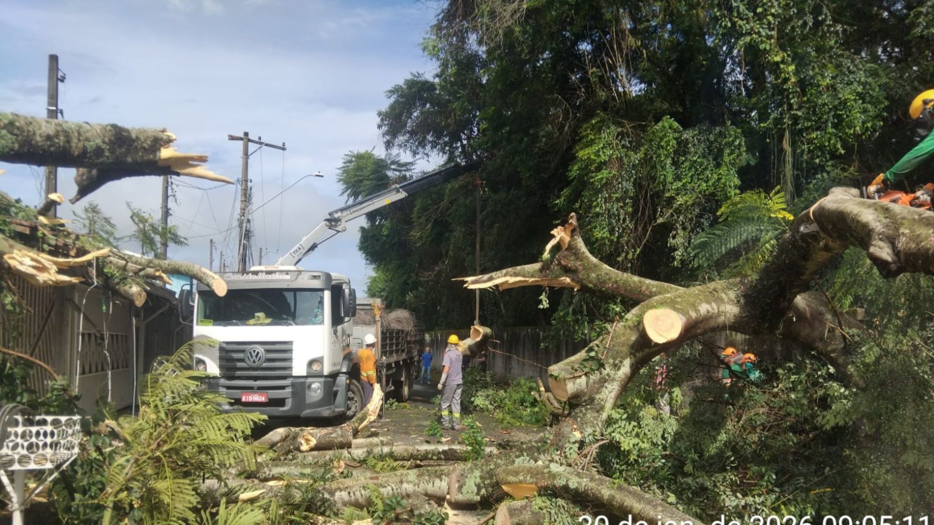 De acordo com a Defesa Civil, a árvore rompeu o muro do terreno onde estava plantada e atravessou a via, atingindo as casas do lado oposto. O impacto rompeu as linhas de energia elétrica, deixando o trecho sem luz. Equipes do Corpo de Bombeiros, da concessionária EDP e da Secretaria de Serviços Públicos trabalharam no local para realizar o corte técnico do tronco e a liberação da rua.