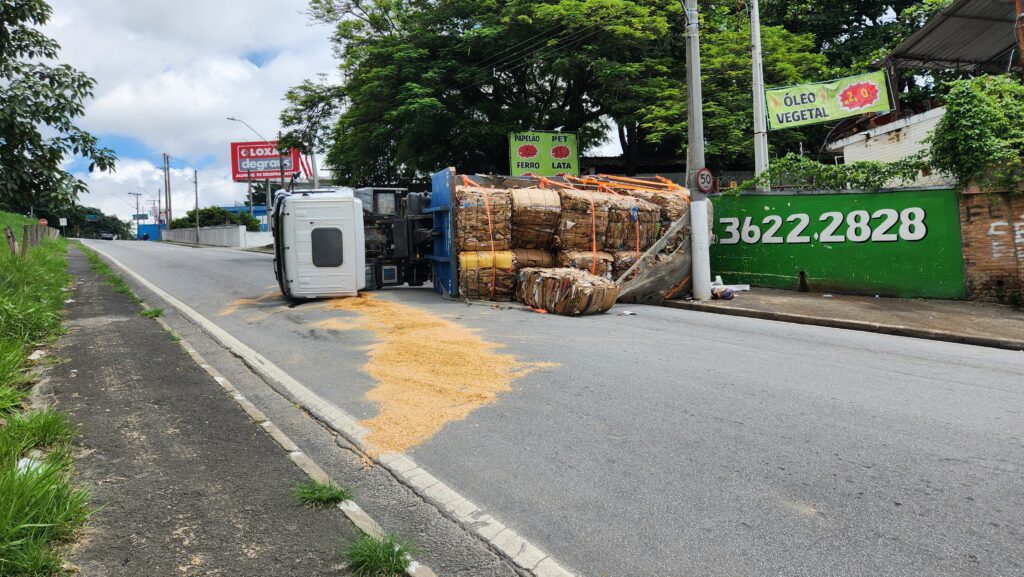 O trânsito em um dos principais eixos de escoamento de Taubaté segue extremamente conturbado na manhã desta sexta-feira (20). Um caminhão carregado com fardos de papelão para reciclagem tombou ao realizar uma manobra de saída de um depósito na Avenida Bandeirantes, na marginal da Via Dutra, sentido São Paulo. O incidente bloqueou totalmente a subida que dá acesso ao posto Petroval e a saída do túnel do bairro Campos Elíseos para quem segue em direção à Avenida Juscelino Kubitschek, forçando motoristas a buscarem rotas alternativas por dentro dos bairros adjacentes.